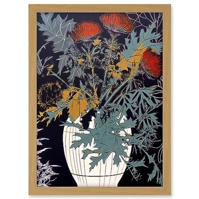 Artery8 Abstract Thistle Vase Dark Linocut Floral Red Green Ochre Scottish Plant Artwork Framed A3 Wall Art Print