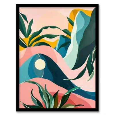 Artery8 Abstract Tropical Leaves Mountains Pastel Colour Living Room Artwork Framed Wall Art Print A4