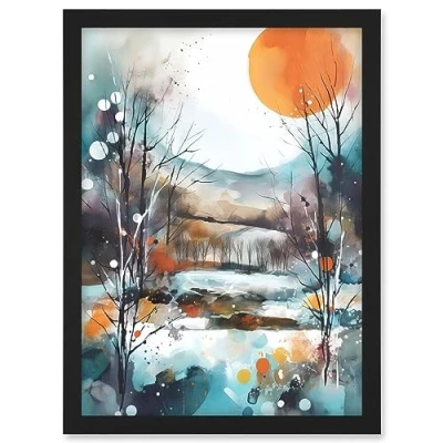Artery8 Abstract Winter Landscape Watercolour Painting Boho Countryside Sunrise Snow Artwork Framed A3 Wall Art Print