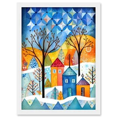 Artery8 Abstract Winter Snowfall Folk Art Artwork Framed Wall Print A4