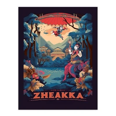 Artery8 Advertisement for Traditional Kabuki Theatre Painting Blue Pink Japanese Temple Mountain Lake Landscape Dance Scene Large Wall Art Poster Print Thick Paper 18X24 Inch