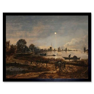 Artery8 Aert Van Der Neer Riverview By Moonlight Painting Art Print Framed Poster Wall Decor 12x16 inch