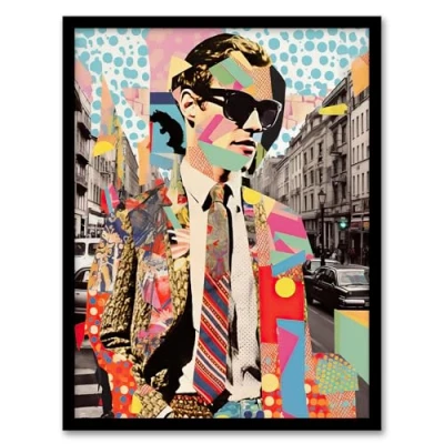 Artery8 All About Patterns Paris Collage Artwork City Fashion Advert Man Suit Portrait Geometric Vibrant Colourful Bold Pop Art Modern Painting Framed Wall Print A4