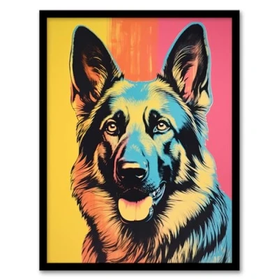 Artery8 Alsatian Dog Multi Coloured German Shepherd Screenprint Risograph Artwork Spot Block Colour Duotone Retro Riso Interior Design Framed Wall Art Print A4