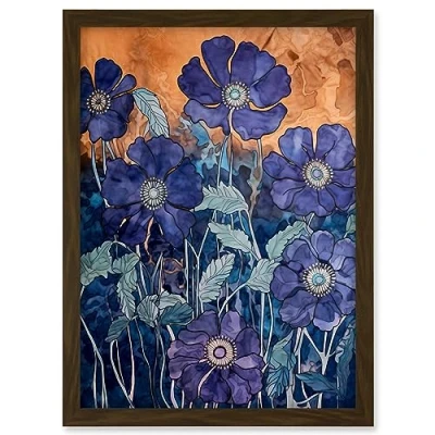 Artery8 Anemone Flower Blue and Amber Watercolour Painting Artwork Framed A3 Wall Art Print