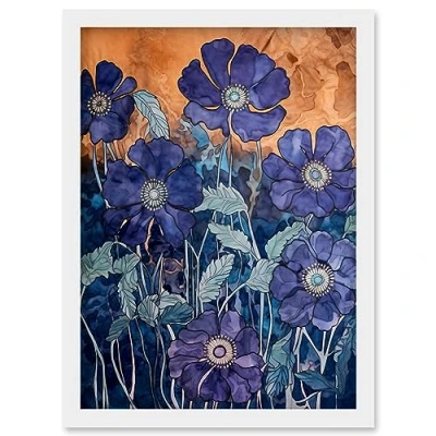 Artery8 Anemone Flower Blue and Amber Watercolour Painting Artwork Framed Wall Art Print A4