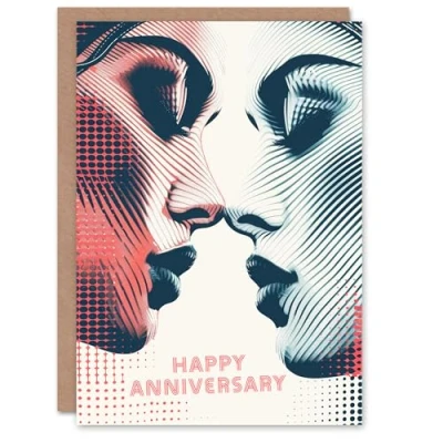 Artery8 Anniversary Card Lesbian Gay Couple Kiss Pink Blue Women Faces For Her Wife Woman Partner Girlfriend Greeting