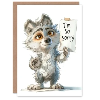 Artery8 Apology Card Cute Cheeky Wolf Pup Holding Sorry Sign Cartoon Blank Arty Art All Occasion Greeting