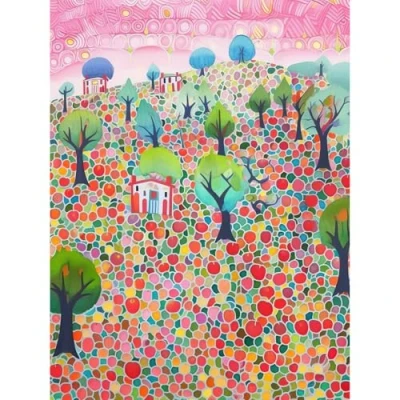Artery8 Apple Tree Orchard Fields At Sunset Folk Art Watercolour Painting Large Wall Poster Print Thick Paper 18X24 Inch
