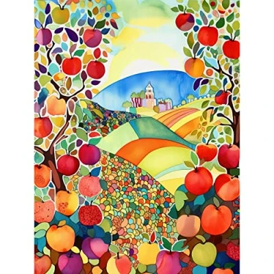 Artery8 Apple Tree Orchard Fields In Summer Folk Art Landscape Watercolour Painting Large Wall Poster Print Thick Paper 18X24 Inch