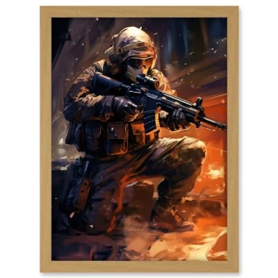 Artery8 Army Warfare Desert Sniper Explosion Flames Oil Painting Soldier Action Scene Artwork Framed A3 Wall Art Print