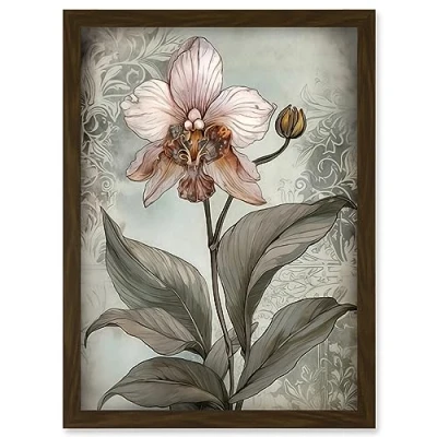Artery8 Art Nouveau Pink Orchid Bloom Flower Watercolour Artwork Framed Wall Print A4