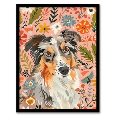 Artery8 Australian Sheepdog Floral Portrait Watercolour Living Room Artwork Framed Wall Art Print A4