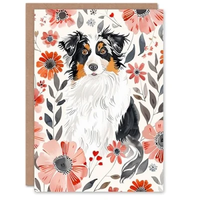 Artery8 Australian Shepherd Dog Lover Floral Rustic Blank For Him Or Her Art Birthday Card