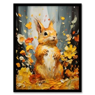 Artery8 Autumn Again Red Squirrel In Amber Leaves Orange Heavy Oil Painting Artwork Framed Wall Art Print A4