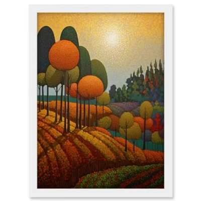 Artery8 Autumn Fields Pointillism Painting Amber Orange Green Countryside Landscape Artwork Framed A3 Wall Art Print