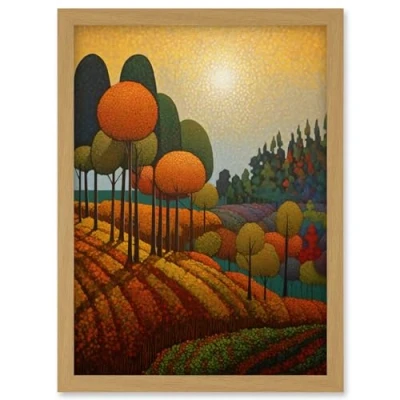 Artery8 Autumn Fields Pointillism Painting Amber Orange Green Countryside Landscape Artwork Framed Wall Art Print A4