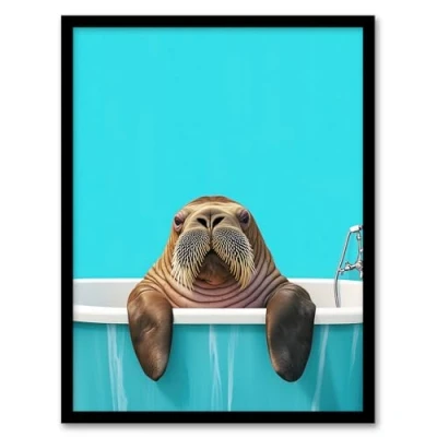 Artery8 Bath Time Cute Walrus in Bathtub Vibrant Fun Bathroom Toilet Artwork Framed Wall Art Print A4