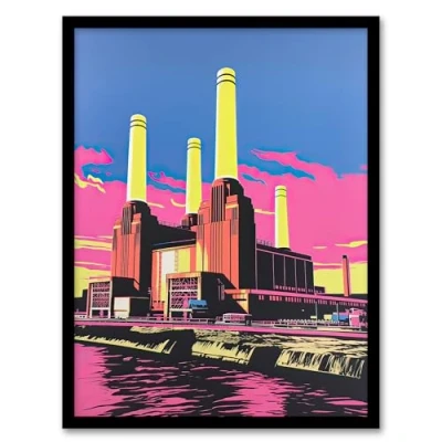 Artery8 Battersea Power Station Pop Art Artwork Vibrant Pink Yellow Blue River Thames London Landmark Framed Wall Print A4