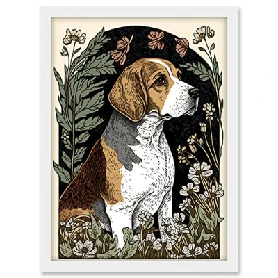 Artery8 Beagle Dog with Daisies Modern Stylised Illustration Artwork Framed A3 Wall Art Print