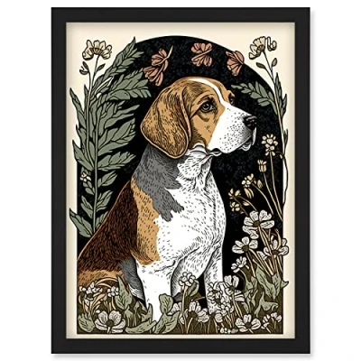 Artery8 Beagle Dog with Daisies Modern Stylised Illustration Artwork Framed Wall Art Print A4