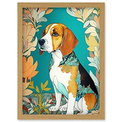 Artery8 Beagle Dog With Floral Frame and Ornate Fur Coat Colourful Modern Art Nouveau Illustration Artwork Framed Wall Print A4