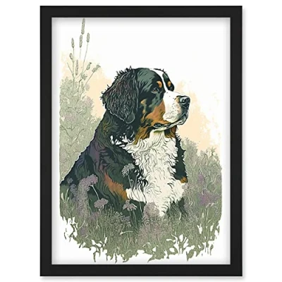 Artery8 Bernese Mountain Dog in Wild Flower Field Watercolour Illustration Artwork Framed Wall Art Print A4
