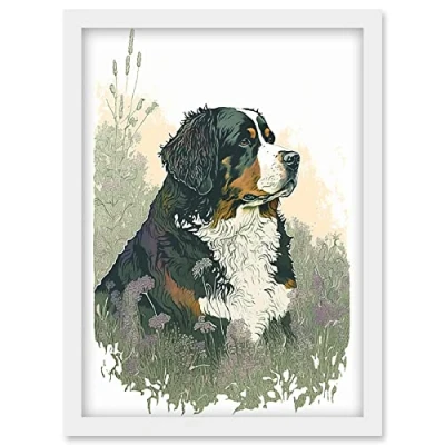 Artery8 Bernese Mountain Dog in Wild Flower Field Watercolour Illustration Artwork Framed Wall Art Print A4