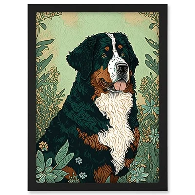 Artery8 Bernese Mountain Dog in Wildflower Field Modern Illustration Artwork Framed A3 Wall Art Print