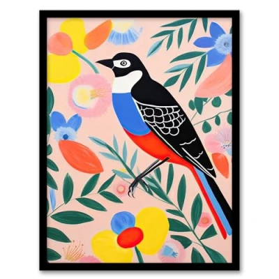 Artery8 Bird and Abstract Spring Flowers Colourful Oil Painting Vibrant Floral Pattern Artwork Framed Wall Art Print A4