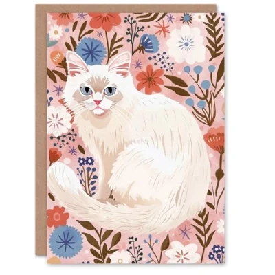 Artery8 Birman Cat Lover Pink Blue Floral Pet Portrait For Her Woman Birthday Card