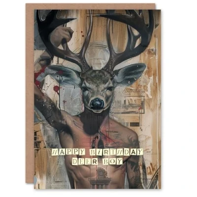 Artery8 Birthday Card Abstract Deer Boy Head Man Tattoo Punk Drawing For Him Male Dad Brother Son Papa Grandad Greeting