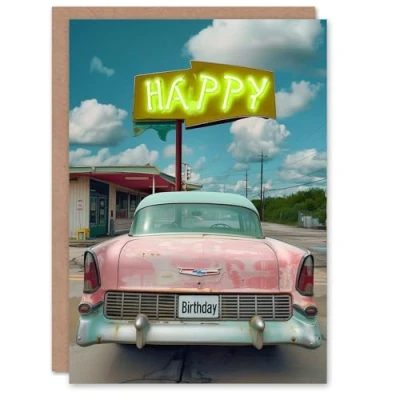 Artery8 Birthday Card Americana Diner Car Photo Retro Country For Him Man Male Dad Brother Son Papa Grandad Greeting