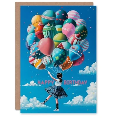 Artery8 Birthday Card Balloons Girl Flying in Sky Clouds For Child Kids Son Daughter Greeting