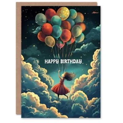 Artery8 Birthday Card Balloons Girl Flying Night Sky Stars Clouds For Child Kids Son Daughter Greeting