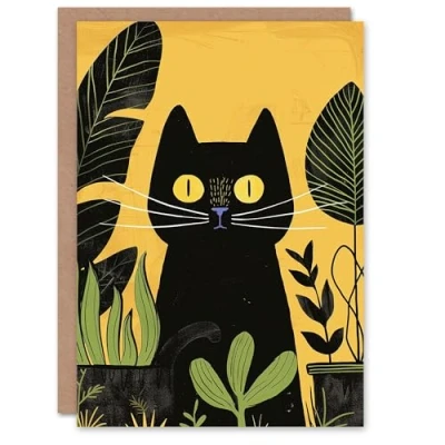 Artery8 Birthday Card Black Cat Pet Plant Lover Garden Yellow Botanical Blank Arty Art All Occasion Greeting