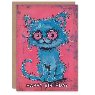 Artery8 Birthday Card Blue Cat Lover Kitty Pet Cartoon Cute For Child Kids Son Daughter Greeting