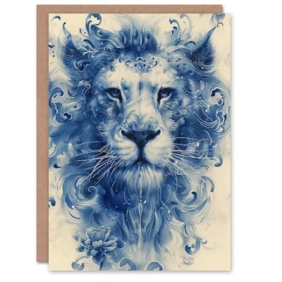 Artery8 Birthday Card Blue Chinese Porcelain Floral Lion Head For Him Man Male Dad Brother Son Papa Grandad Greeting