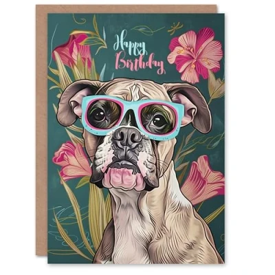 Artery8 Birthday Card Boxer Dog Lover Sunglasses Floral Portrait For Her Gran Sister Niece Daughter Wife Woman Greeting