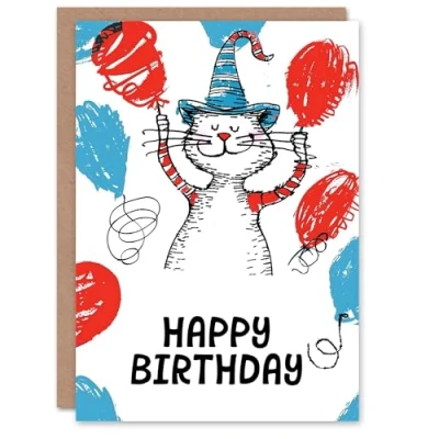 Artery8 Birthday Card Cat Lover Balloons Hat Childrens Book Drawing For Child Kids Son Daughter Greeting