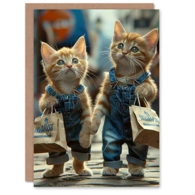 Artery8 Birthday Card Cat Lover Cute Kittens Dungarees Shopping For Child Kids Son Daughter Greeting