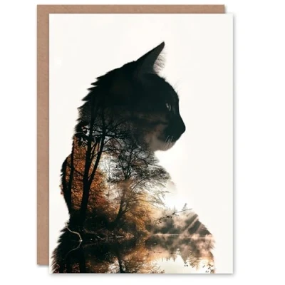 Artery8 Birthday Card Cat Lover Double Exposure Forest Lake Landscape Blank Arty Art All Occasion Greeting