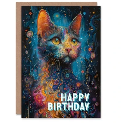 Artery8 Birthday Card Cat Lover Galactic Kitty Psychedelic Concept Art For Her Gran Sister Niece Daughter Wife Woman Greeting