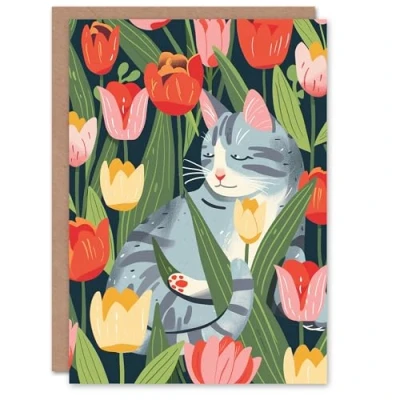 Artery8 Birthday Card Cat Lover Grey Kitty Among Tulip Flowers For Her Gran Sister Niece Daughter Wife Woman Greeting