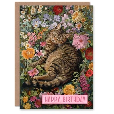 Artery8 Birthday Card Cat Lover Grey Tabby Laying in Flower Meadow For Her Gran Sister Niece Daughter Wife Woman Greeting