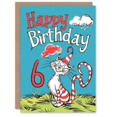 Artery8 Birthday Card Cat Lover Red Stripes Hat Kitty Strange Fun 6th 6 Year Old For Child Kids Son Daughter Greeting