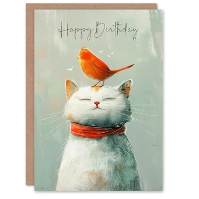 Artery8 Birthday Card Cat Pet Red Bird Happy Friends Illustration For Son Daughter Girl Boy Kids