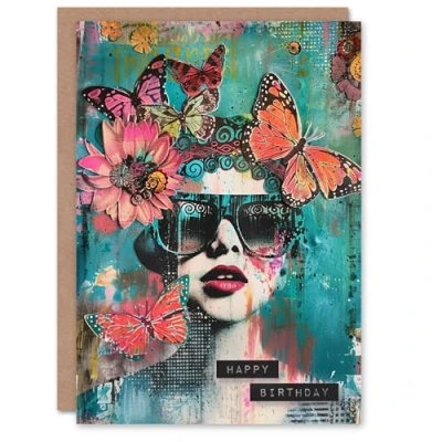 Artery8 Birthday Card Collage Butterflies Sunglasses Portrait For Her Gran Sister Niece Daughter Wife Woman Greeting