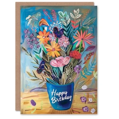Artery8 Birthday Card Colourful Flower Bouquet in Blue Vase Painting For Her Gran Sister Niece Daughter Wife Woman Greeting