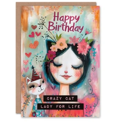 Artery8 Birthday Card Crazy Cat Lady For Life Cute Lover Portrait Her Gran Sister Niece Daughter Wife Woman Greeting